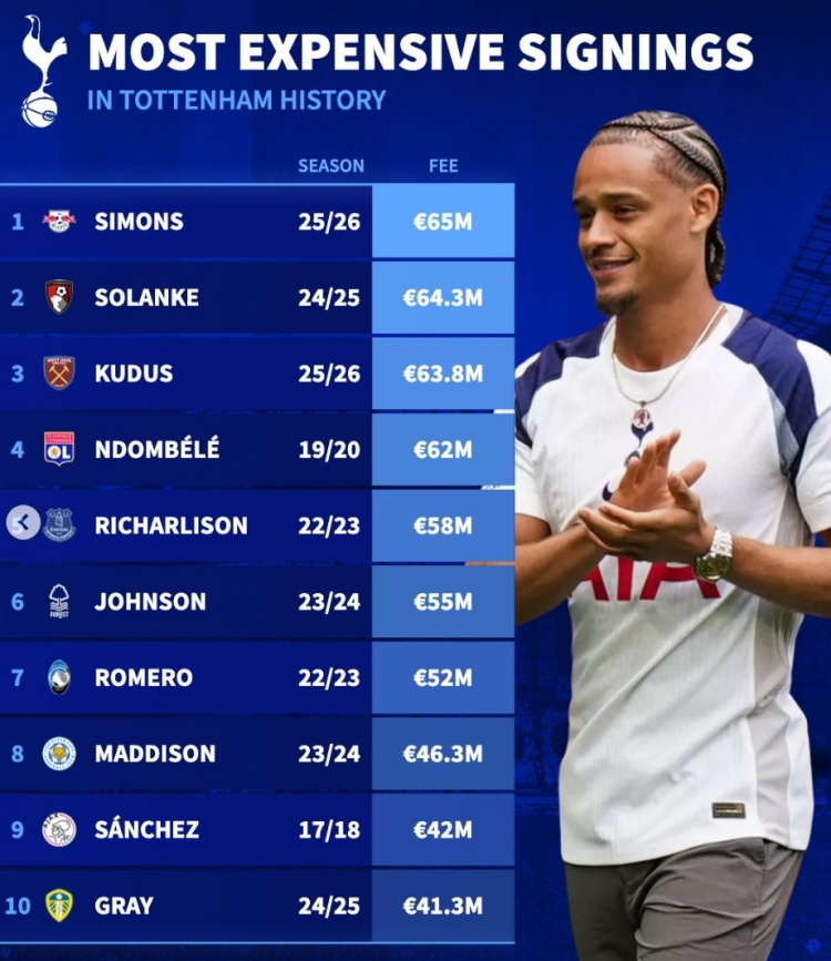 8868体育-列维热刺生涯最贵引援榜:西蒙斯压索兰克成标王,孙兴慜未进前十