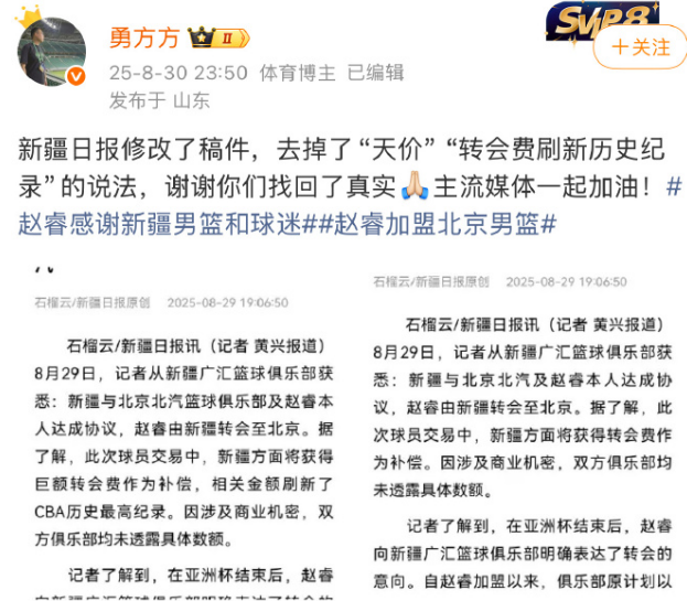 之前有新疆媒体表示,新疆队在送走赵睿过程中,从北京队获得了“巨额转会费作为补偿,甚至刷新了CBA史上最高纪录”,后来修改掉了该内容。