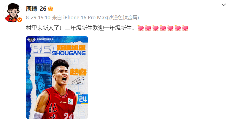 北京队当家球星周琦在个人社媒上发文欢迎赵睿加盟。话说,周琦若出战了今年的亚洲杯,哪怕就替换掉余嘉豪的角色,也许中国男篮才是金牌得主。